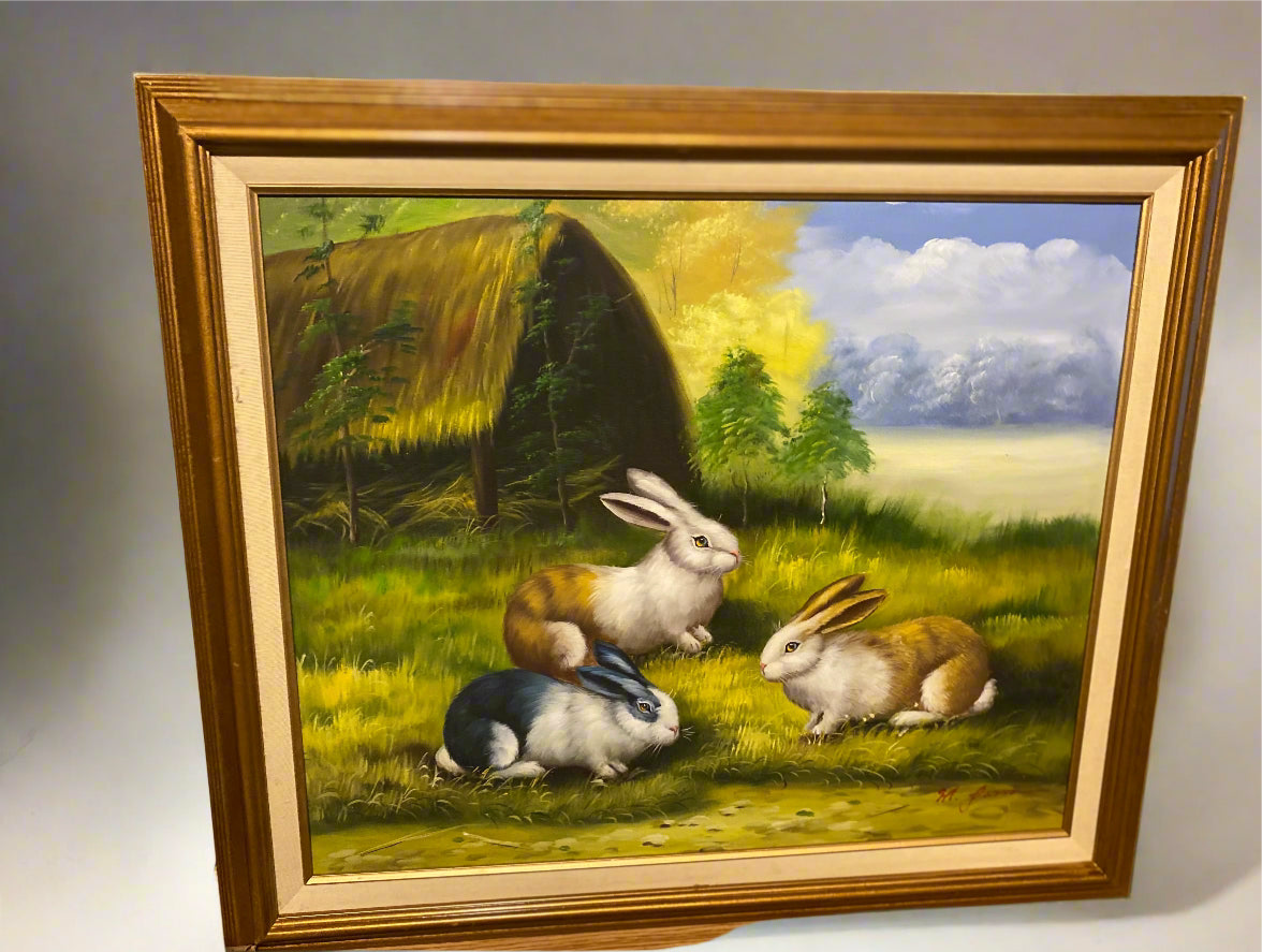 This painting captures the gentle presence of rabbits nestled in a serene field, showcasing expert brushwork that highlights the natural textures and subtle lighting of the scene. Ideal for adding a touch of tranquility and refined nature-inspired elegance to any living space, this artwork invites quiet reflection and appreciation of wildlife. Its detailed composition and soft palette make it a timeless piece for collectors and enthusiasts alike.